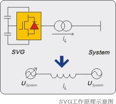 SVG是屬于柔性交流輸電系統(tǒng)(FACTS)的重要裝置,是繼電容器補償、磁控電抗器MCR型SVC、TCR型SVC之后的第三代動態(tài)無功補償技術(shù)。它以三相大功率電壓逆變器為核心,其輸出電壓通過變壓器或電抗器接入系統(tǒng),與系統(tǒng)側(cè)電壓保持同頻、同相,通過調(diào)節(jié)其輸出電壓幅值與系統(tǒng)電壓幅值的關(guān)系來確定輸出功率的性質(zhì)與容量,當其幅值大于系統(tǒng)側(cè)電壓幅值時輸出容性無功,小于時輸出感性無功。其原理如右圖所示。